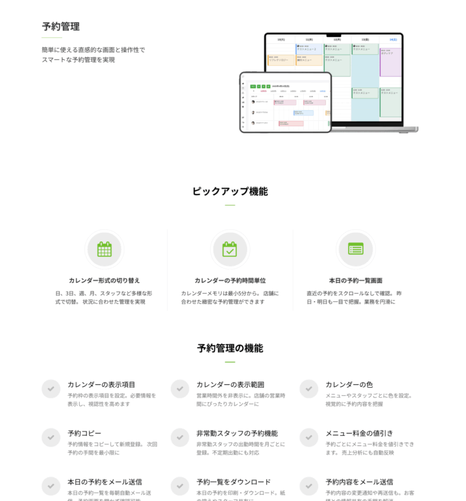 新しくなった機能紹介ページをご覧いただければ、予約受付から予約管理、さらにリピート施策や集計・分析機能まで、店舗運営に必要な機能が網羅されていることがお分かりいただけるはずです。