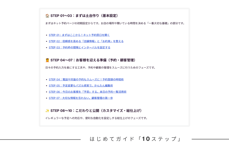 予約システムを導入することは、お店の新しい形をつくる大きな挑戦です。新しくなった「はじめてガイド」は、私たちがあなたの隣で「次はこれですよ」「ここはこうすると楽ですよ」と声をかけるためのツールです。
