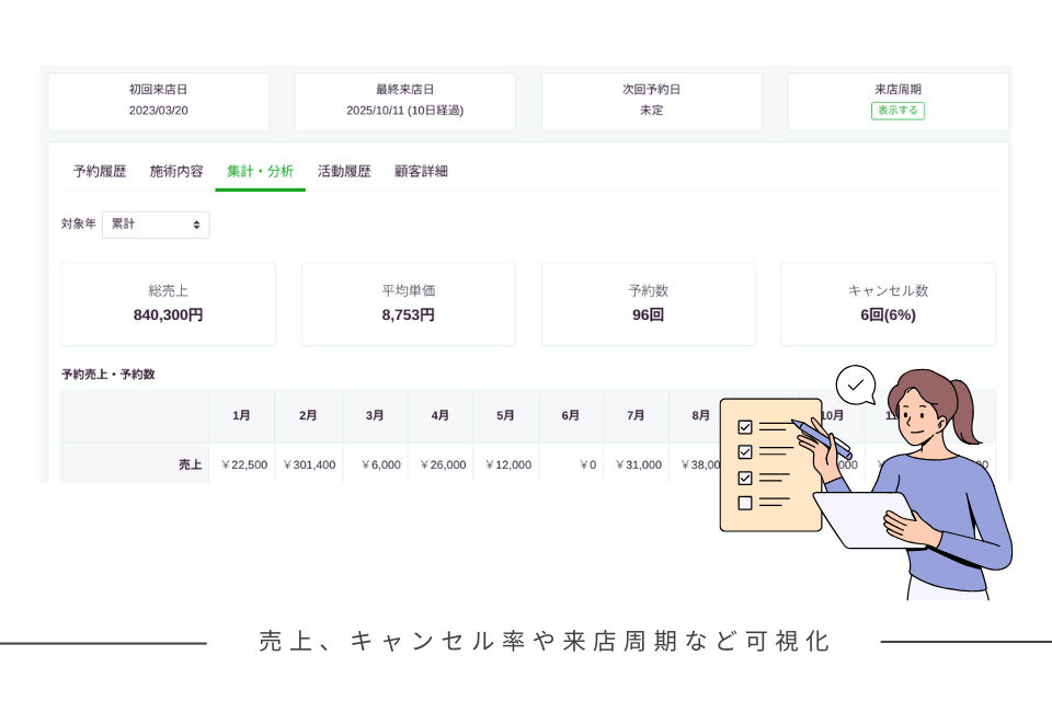 そもそも紙の予約表で正確なキャンセル率を計算するのは至難の業です。しかし、予約システムなら、お客様の平均来店周期、キャンセル回数、最終来店日からの経過日数といった経営に不可欠なデータを自動で蓄積します。