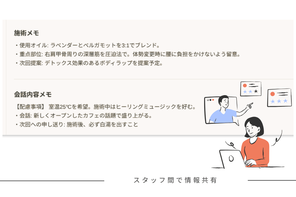 記録した情報は、接客の質を一気に高めます。例えば、「お子様連れのお客様」「常連の〇〇様」「触れてほしくない部位があるお客様」といった情報は、紙では共有が困難です。