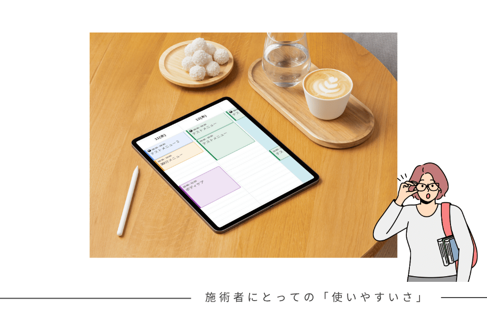 優れた予約システムは、複雑な裏側のロジックを隠し、施術者の行動に最適化された操作性を提供します。