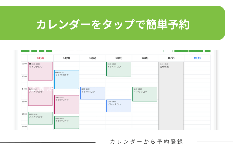 先生が「受付窓口」や「電話」で受けた予約を、その場で予約登録する方法です。からだケアでは、カレンダー画面で空いている時間帯をクリックするだけで簡単に予約登録ができます。