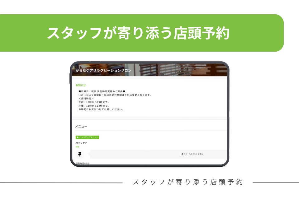 今回はからだケアの「現場でのサポート予約」や「メールアドレスがない方向けネット予約機能」をご紹介します。